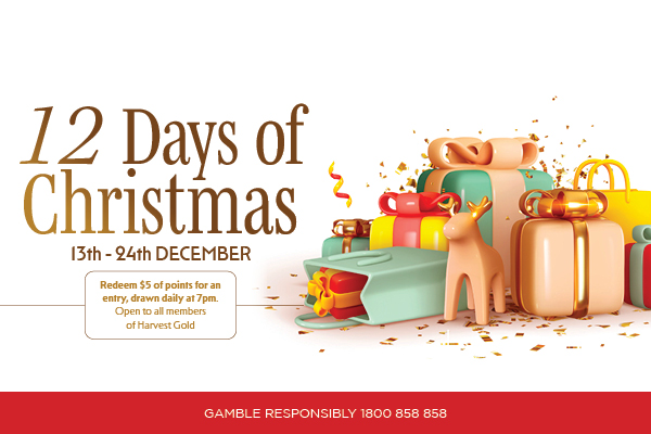 From 13–24 December, redeem $5 in points for an entry into our daily 7pm prize draws. Open to all Harvest Gold members.